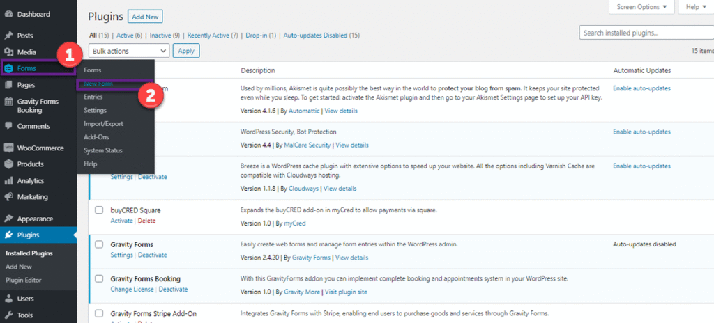 In your WordPress admin dashboard, go to Forms → New Form. A new window will appear and ask you for ‘Form Title’ and ‘Form Description’. Fill in both of these fields and click on Create Form button.