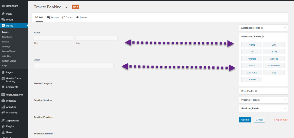 You will need to click on ‘Booking Fields’ available on the bottom-right side of the form for the booking fields. Once it is expanded, you can drag the booking fields and drag them into your form.