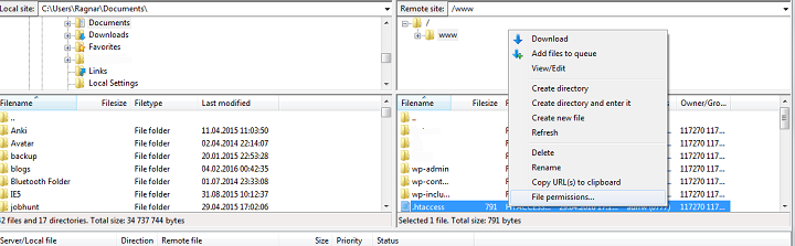 Now head over to the root folder of your WordPress site, and right-click your .htaccess file. You should see the option for “file permissions”.